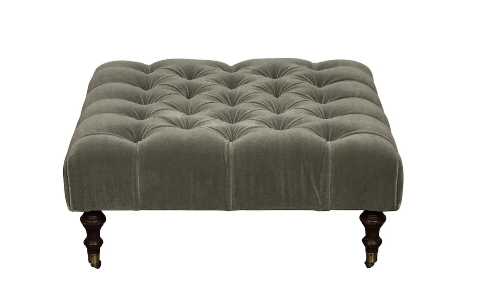 Plush and inviting, this tufted ottoman features luxurious sage green mohair upholstery and classic wooden caster legs for easy placement. Its rich texture and soft tone make it a versatile piece—perfect as a coffee table alternative, additional lounge seating, or a refined accent at the foot of a vintage sofa.